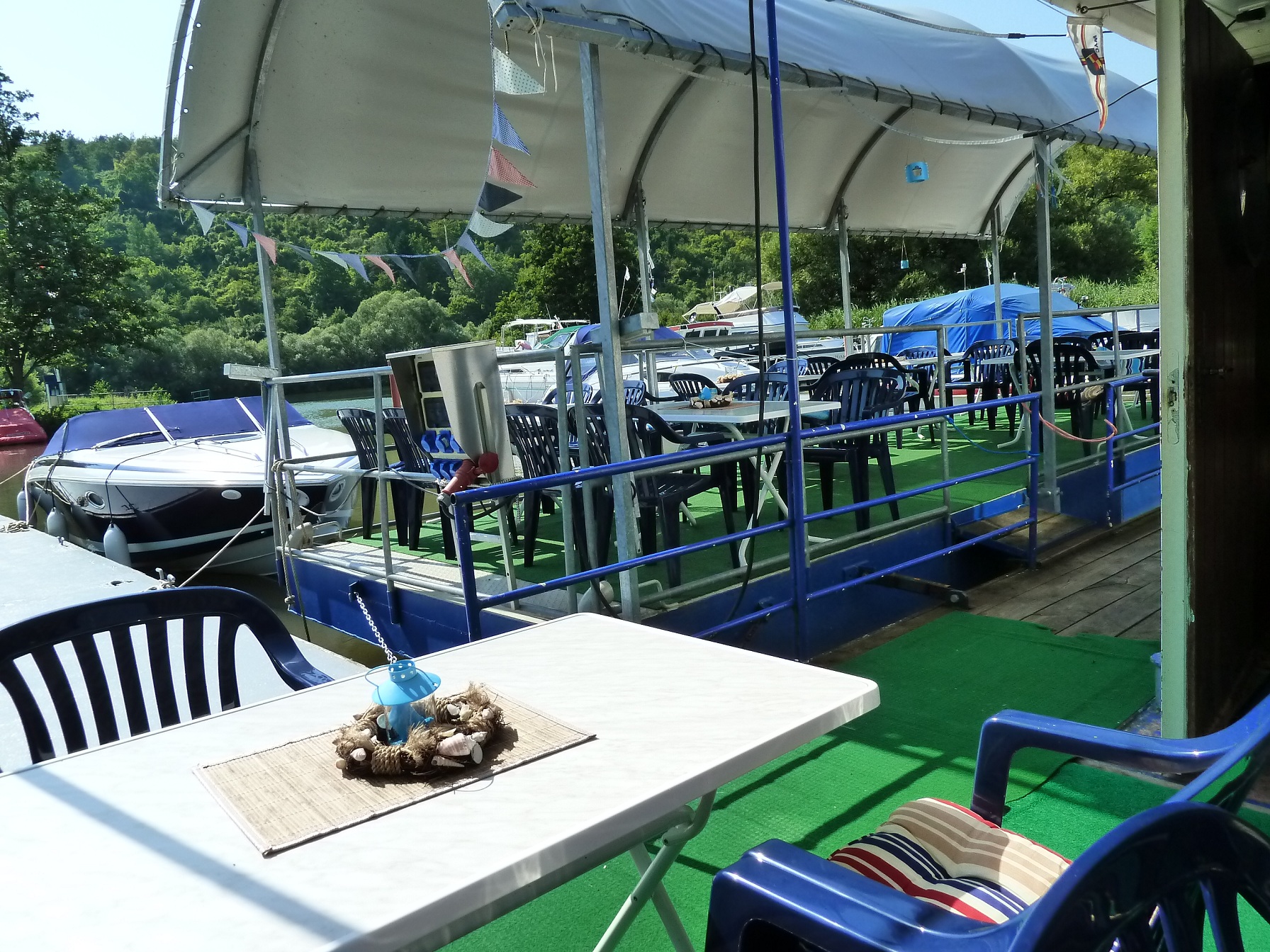 Auf unserem Ponton direkt auf dem Wasser, können Sie Ihren Abend bei einem schönen Glas Wein aus der Region, ausklingen lassen.